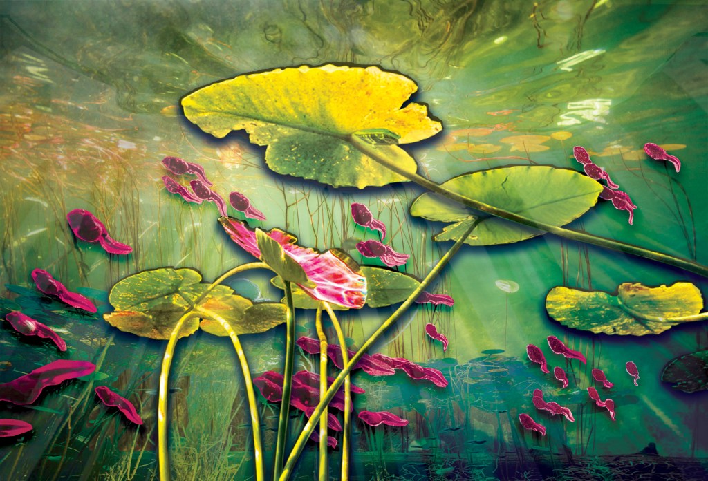 The first postcard I made was the pond postcard. I wanted to show what it was like to be underwater in the pond, with tadpoles surrounding me and nibbling at my toes; looking back up at the surface like I had crossed through a magical portal. I layered photos of water and plants to create the pond, then outlined and added a drop shadow to the lily pads so they pop as the primary elements of my design. I added the tadpoles characters as the secondary elements. I posited them to make the design flow naturally. When the tadpoles were blending into the background, I decided to make them pink. I liked how this looked and fit my childhood imagination theme and changed the color of the critters in the following designs as well.