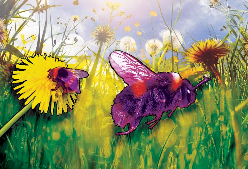For my second design, I really embraced the worms-eye view perspective. When I was little, I used to lie down in the grass and look at the world from the perspective of a bug. Creating this design brought back a flood of memories and I remembered showing my friend this when we were in Charlottesville. I layered photos of grass and this time decided to add a bumblebee super up close to the viewer’s perspective. I focused on the hierarchy of elements for this design. And I made the bumblebees purple against the yellow dandelions.
